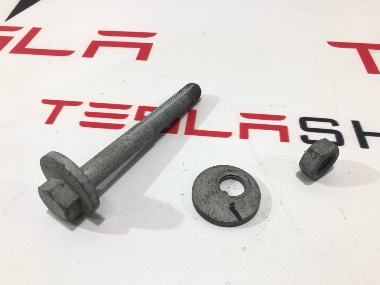 Болт развальный (банана левого/правого) M14-2X125 (10.9) (диаметр шляпки 38мм), гайка болта развального прямого рычага/банана переднего M14x2.0, шайба болта развального банана M14X38X5 (10)-G720 (диаметр 38 мм), Tesla Model XRest, SPlaid